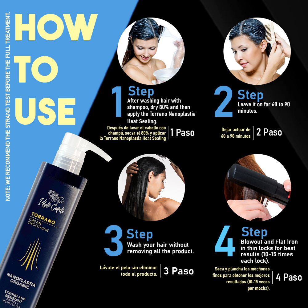 Apply Torrano Nanoplastia Organic all over the hair length respecting the scalp. Leave it on for 60 to 90 minutes (do not exceed this time), rinse the hair (without removing all the product).