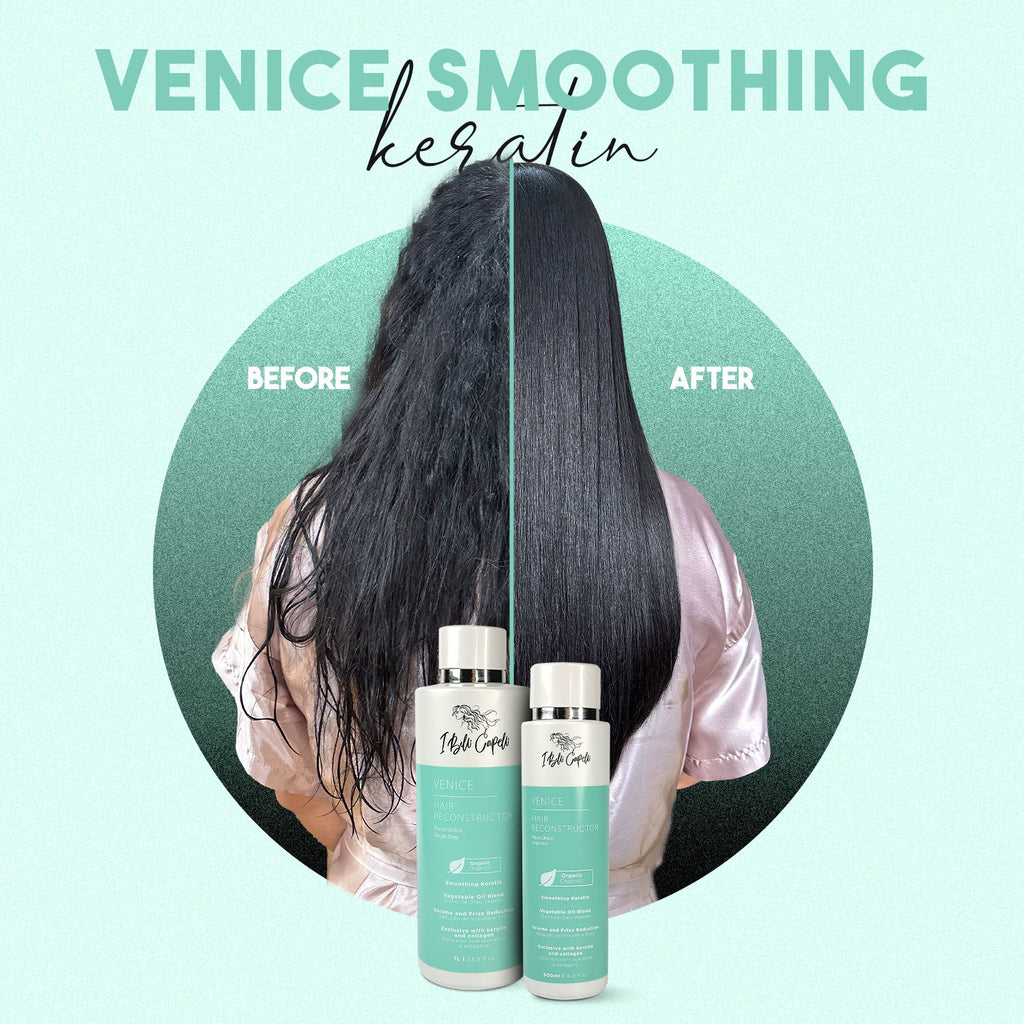 Venice Smoothing Keratin Hair Reconstructive a été développé avec un complexe défrisant les cheveux , qui agit en synergie sur les cheveux.