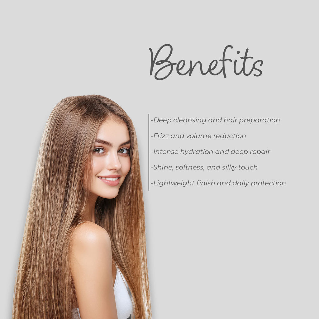 Composed of the Deep Cleansing Anti-Residue Shampoo, Organic B-tox Mask and Repairing Oil, it provides hair straightening, deep cleansing, hair rejuvenation, frizz control, intense shine and sealed ends.
