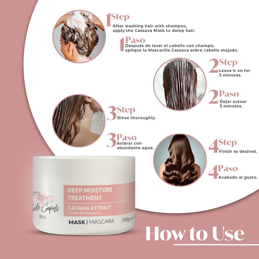 Applicare la Manioca Mask sui capelli umidi, massaggiando delicatamente ciocca per ciocca. Lasciare agire per 3 minuti e risciacquare.