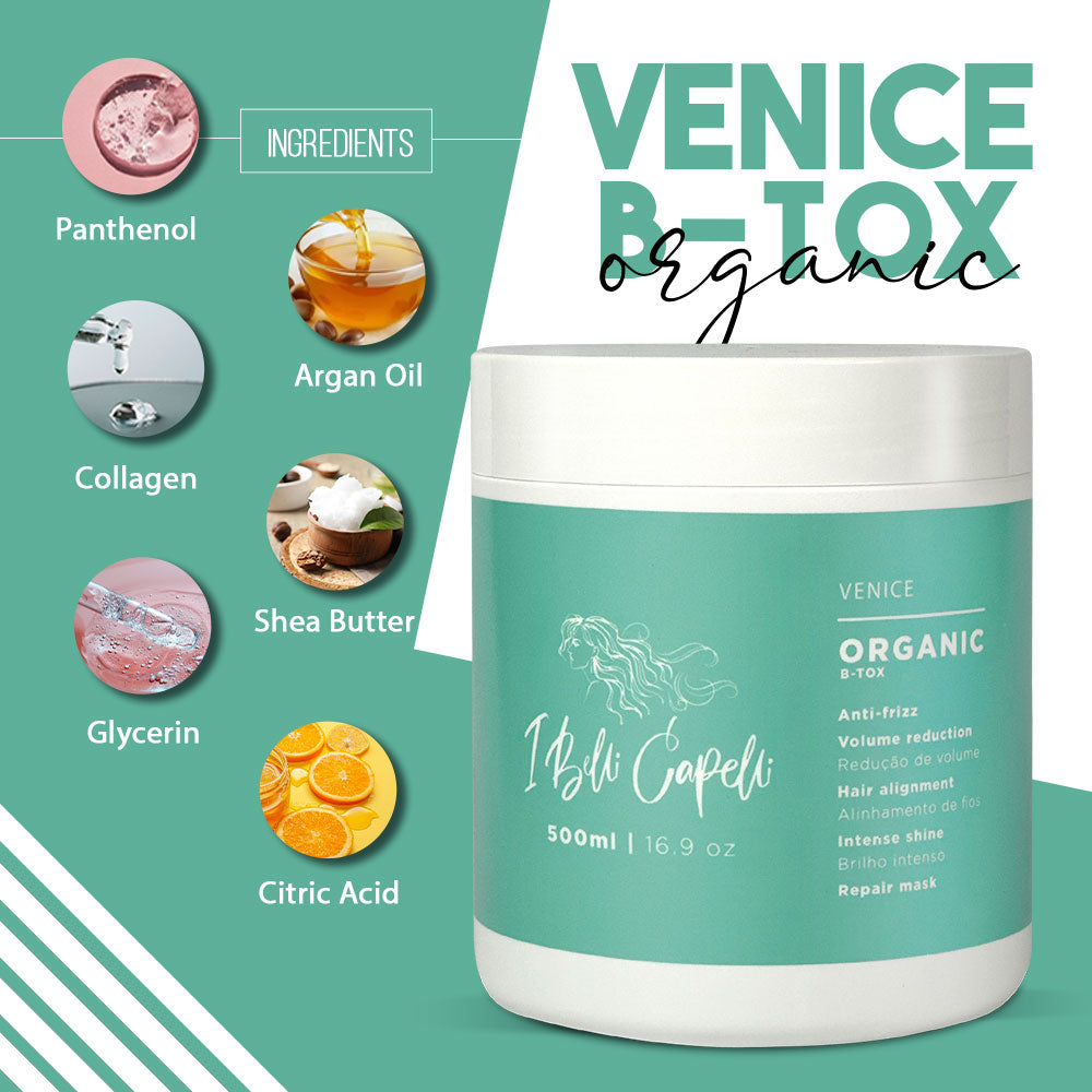 Kit I Belli Capelli Venice Organic B-tox è stato sviluppato con una combinazione di Olio di Argan, in sinergia con Pantenolo e Cheratina Quaternizzata, con l'obiettivo di favorire la ricostruzione capillare, ridurre la rottura dei capelli e restituire nutrienti ai capelli .