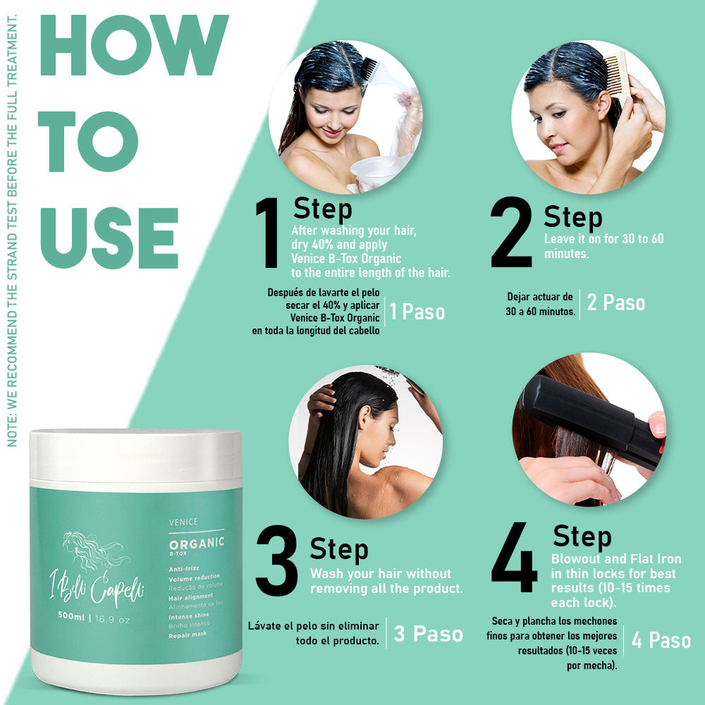 Dopo aver lavato con lo Shampoo Antiresiduo, asciugare il 40% dei capelli quindi applicare Organic B-tox e lasciare agire dai 30 ai 60 minuti fino ad ottenere un'idratazione totale. Risciacquare i capelli solo se lo ritieni necessario per rimuovere il prodotto in eccesso, quindi asciugarli, dividerli in ciocche e lisciare ciascuna ciocca da 10 a 15 volte.